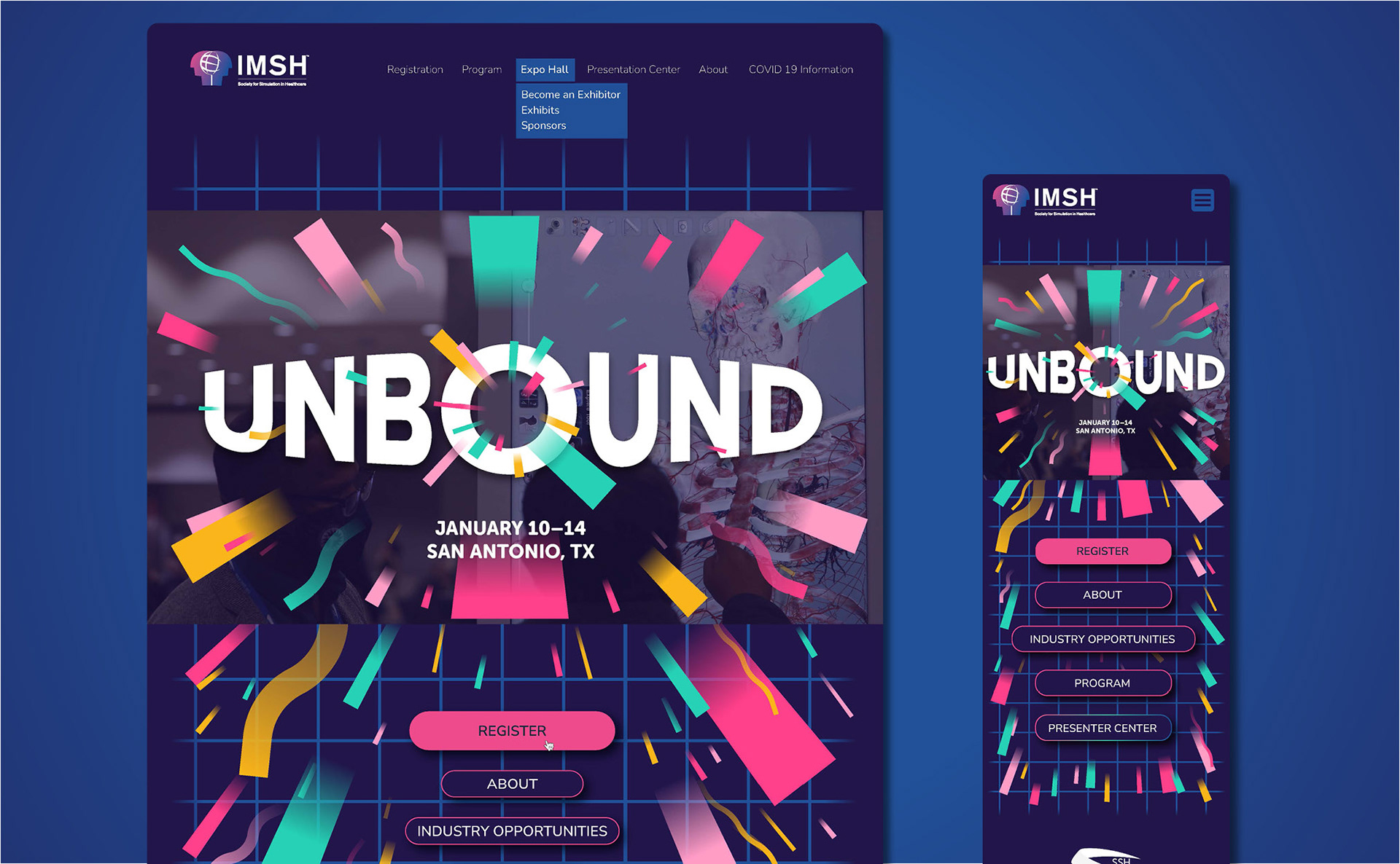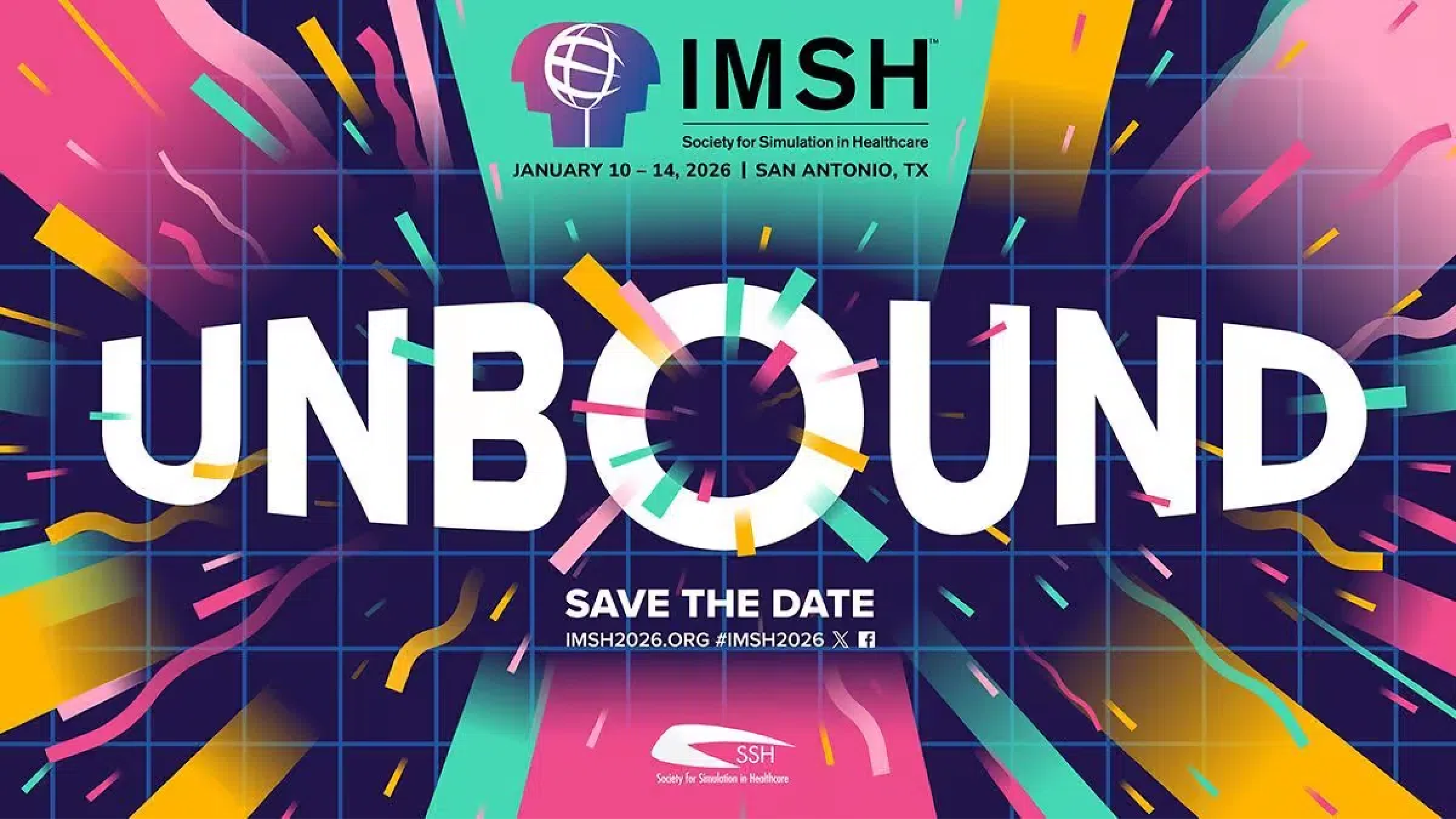 The IMSH 2026 theme that expresses the limitless opportunities and advances for SSH’s members and their industry is “UNBOUND”. The design shows the expanding future of the healthcare simulation field through the expanding bursts of colors coming out towards the viewer.